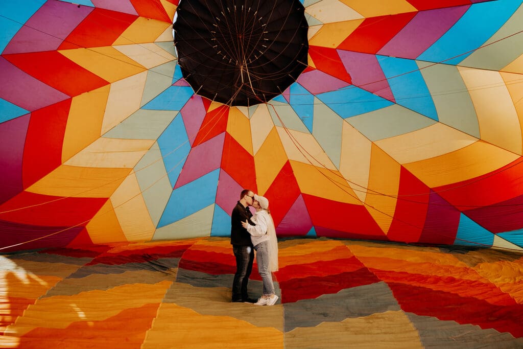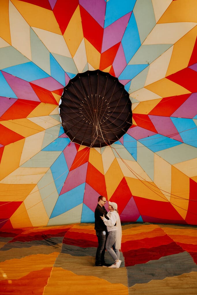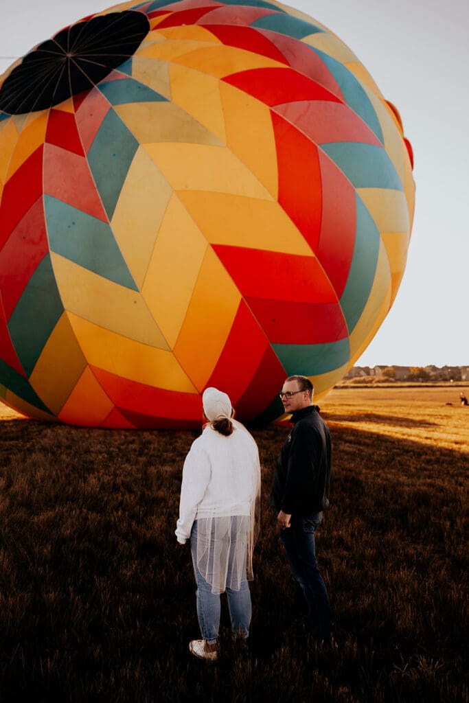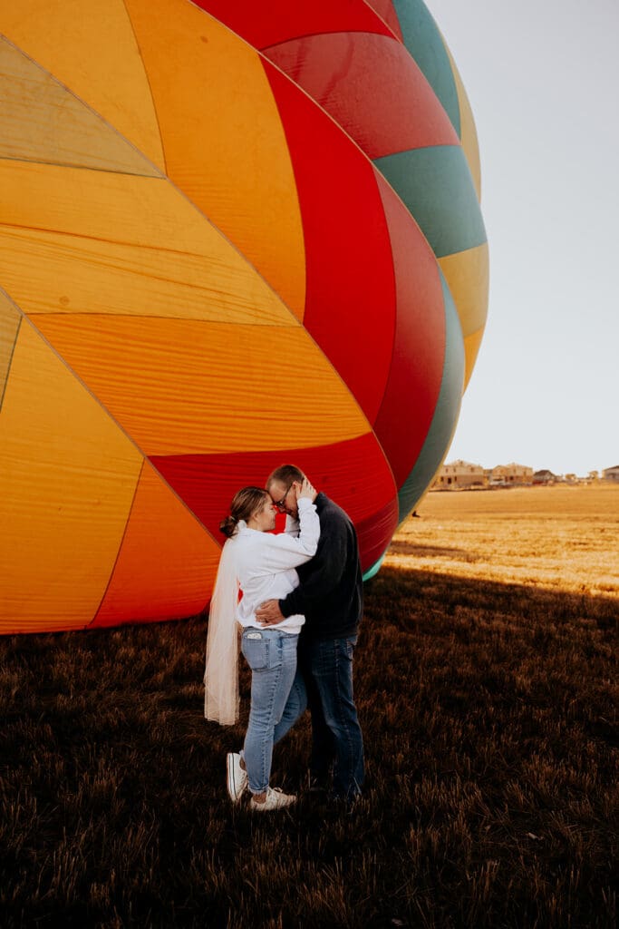 We started the morning bright and early to capture that perfect golden-hour light. The Denver sunrise did not disappoint — soft skies, glowing colors, and the peaceful quiet that only early mornings can bring. The balloon crew was incredibly kind and even allowed us to step inside the hot air balloon as it was inflating. This gave us the chance to take some truly one-of-a-kind elopement portraits surrounded by vibrant color and light.